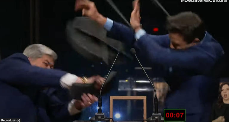 Datena agride Pablo Marçal com uma cadeira durante debate;